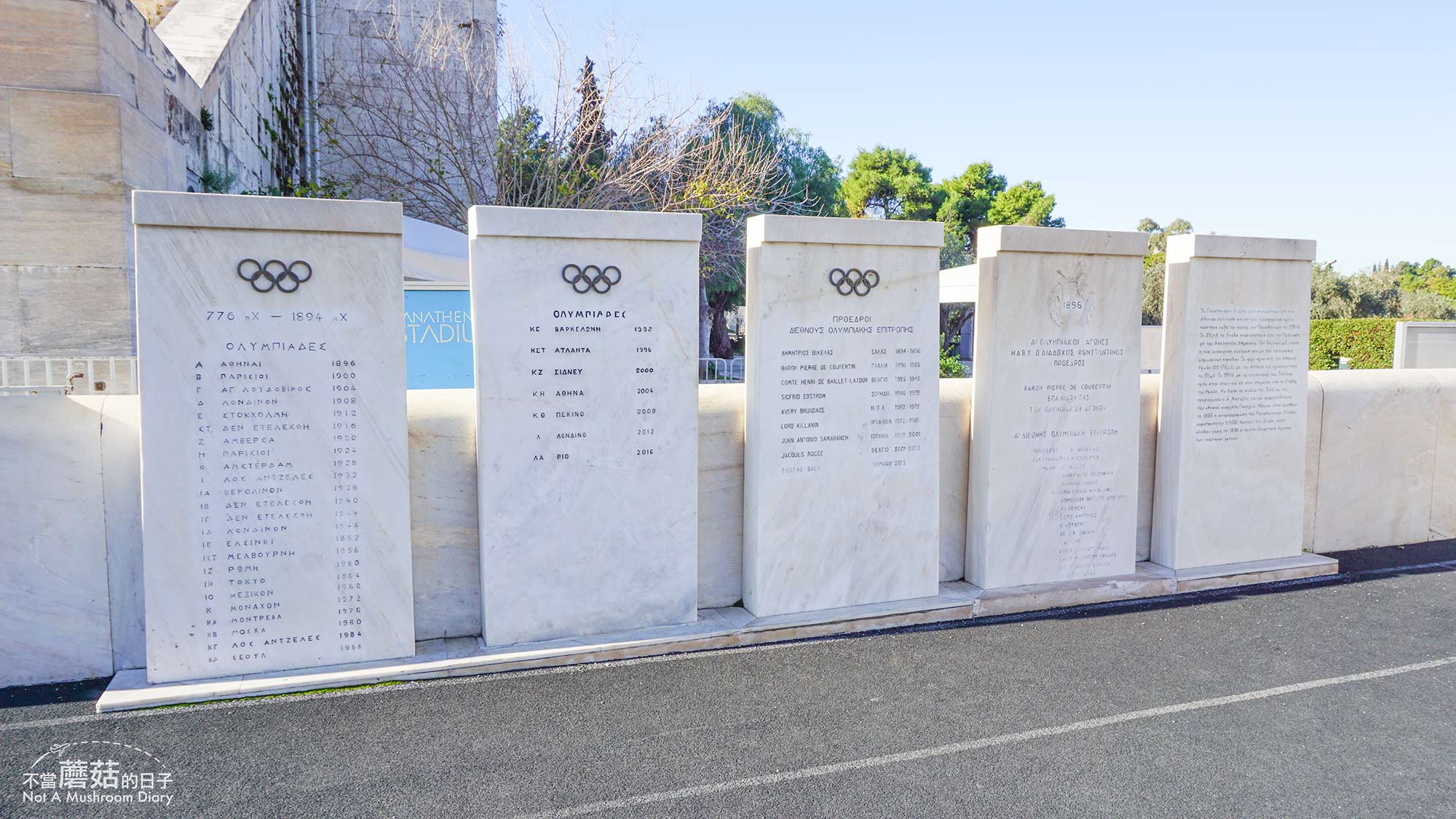 競技場最高的座位還能遠眺衛城,看來這邊應該是一個很有名的攝影位置,因為有好多人都在這邊拍衛城啊!門口還有歷屆奧運的舉辦地和奧委會主席的大理石碑,特別的是都是用希臘文寫的,一個英文字都沒有,感覺是完完整整的保存了古希臘文化的精髓!