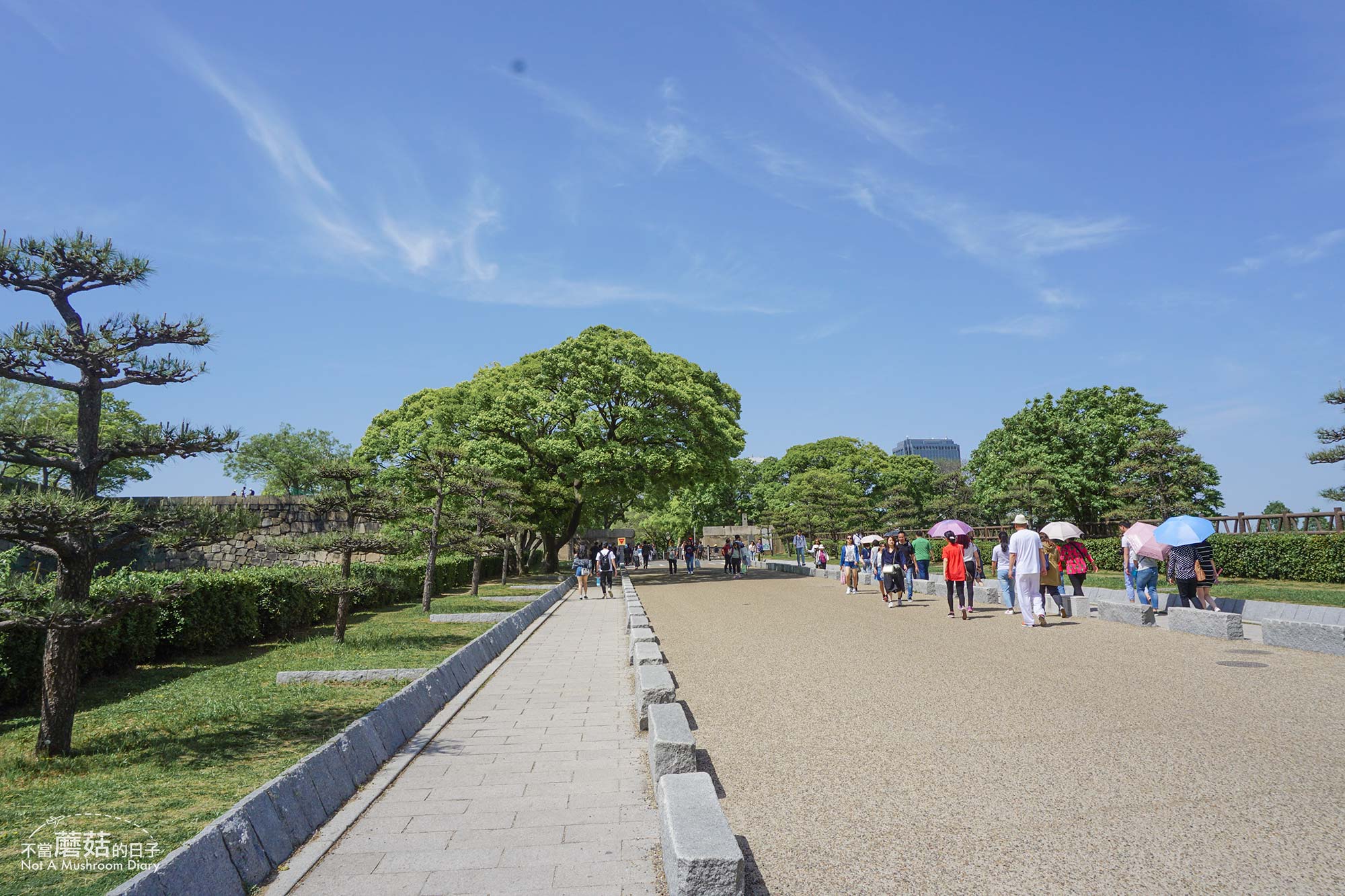 沿著參觀道路往前走,就可以看到大阪城了。現在的大阪城天守是1931年重建的三代目,而大阪城周圍的綠地也是在二戰之後才改建成史蹟公園。